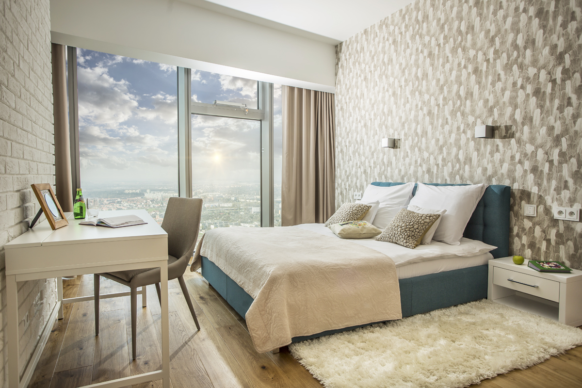 Apartamenty o powierzchni 70m² oraz 100m², usytuowane na 28, 29, 33, 34 oraz 39 piętrze, z malowniczym widokiem na Wrocław. Apartamenty składają się z dwóch pokoi, a sypialnie zostały zaprojektowane z myślą o prywatności i wygodzie. Lokale oferują także dużą, otwartą część dzienną z aneksem kuchennym i łazienką, wyposażoną w prysznic lub wannę.