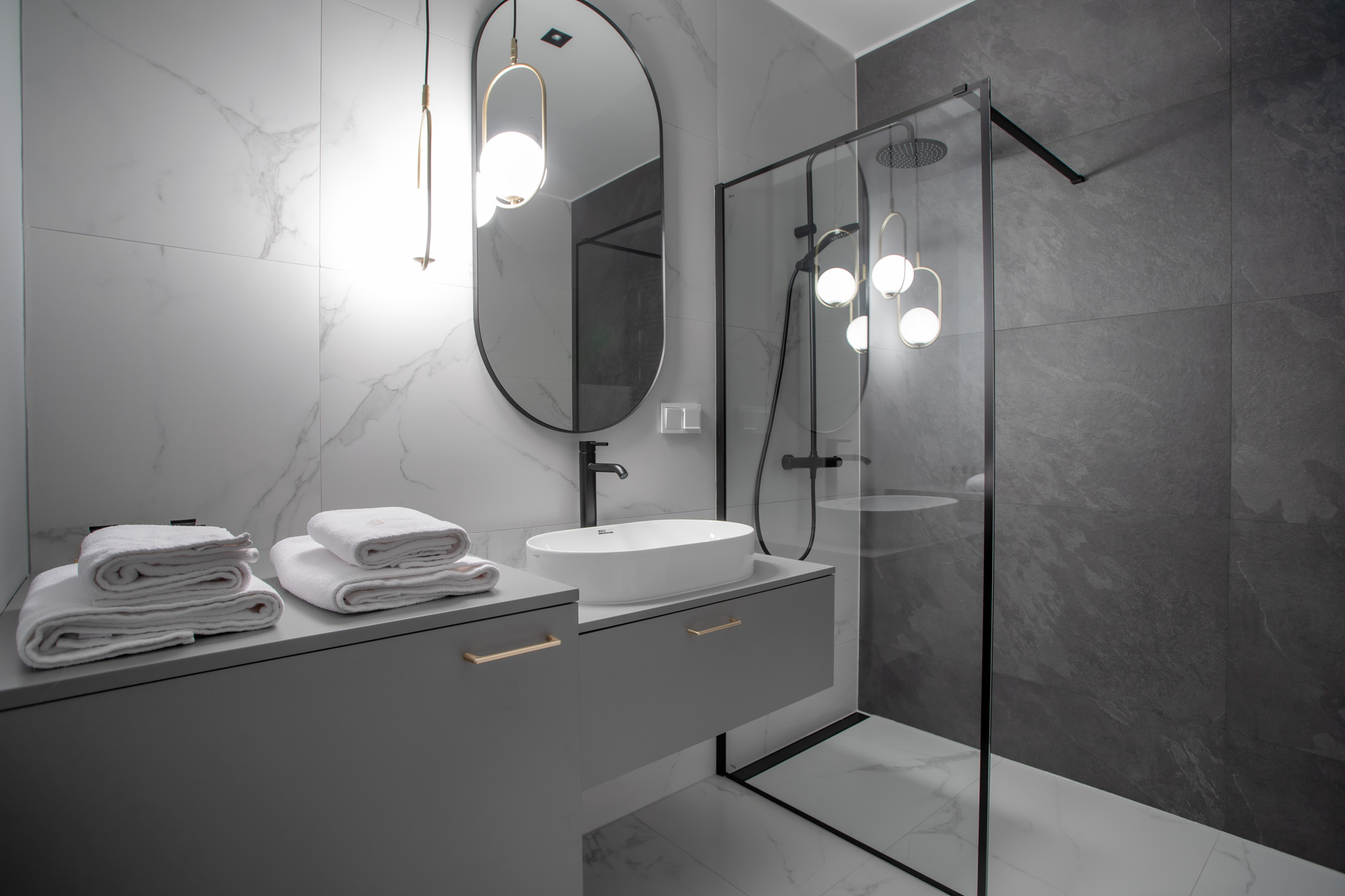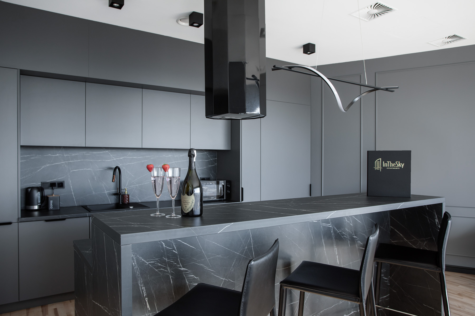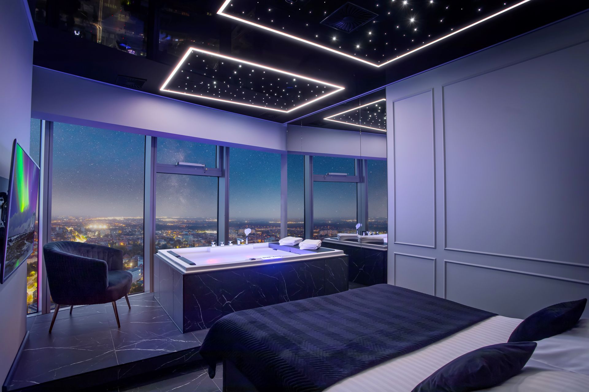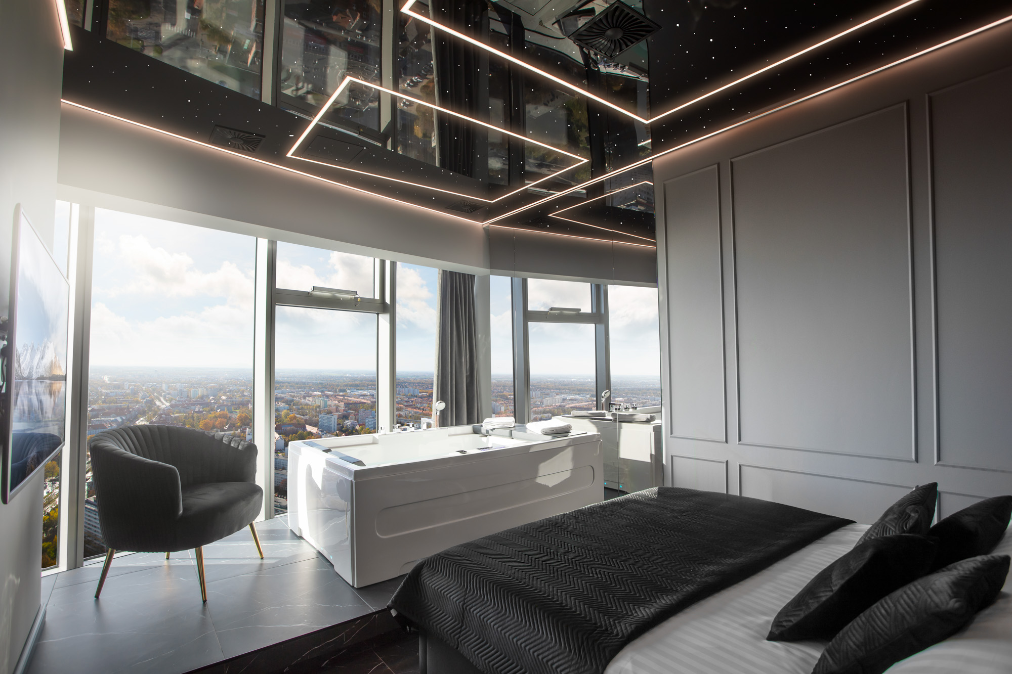 Die stilvollen 70 m² großen Wohnungen, die sich im 33. bis 38. Stockwerk und bieten einen Blick nach Osten oder Südosten. Jedes Detail sorgfältig durchdacht, so dass 2-Zimmer-Wohnungen mit einem Wohnzimmer und einem geschlossenen Schlafzimmer. Der Jacuzzi befindet sich auf einer Plattform neben den Fenstern, über dem Jacuzzi befindet sich eine gespannte Decke, die den Sternenhimmel imitiert und dem Interieur einen einzigartigen Charakter des Innenraums. Das Badezimmer ist mit einer Duschkabine ausgestattet.